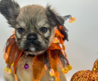 Sauce is a Black & Tan Full Fluffy French Bulldog