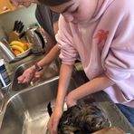 The pups had their first bath today. They smell SO good! My friend and her young daughters came over and helped. We clipped nails, and cut the hair around our booties, and tonight, they will sleep in a crate for the first time. Big Labrador-size crate, all snuggled together.