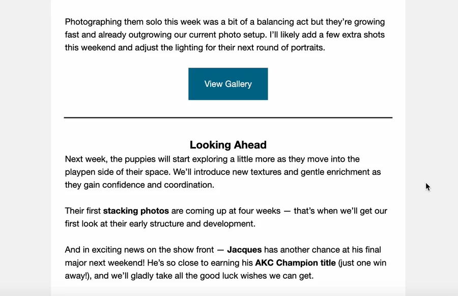 Together, you’ll choose the puppy that’s right for you, stay in touch with regular updates, and plan how to bring your new puppy home.