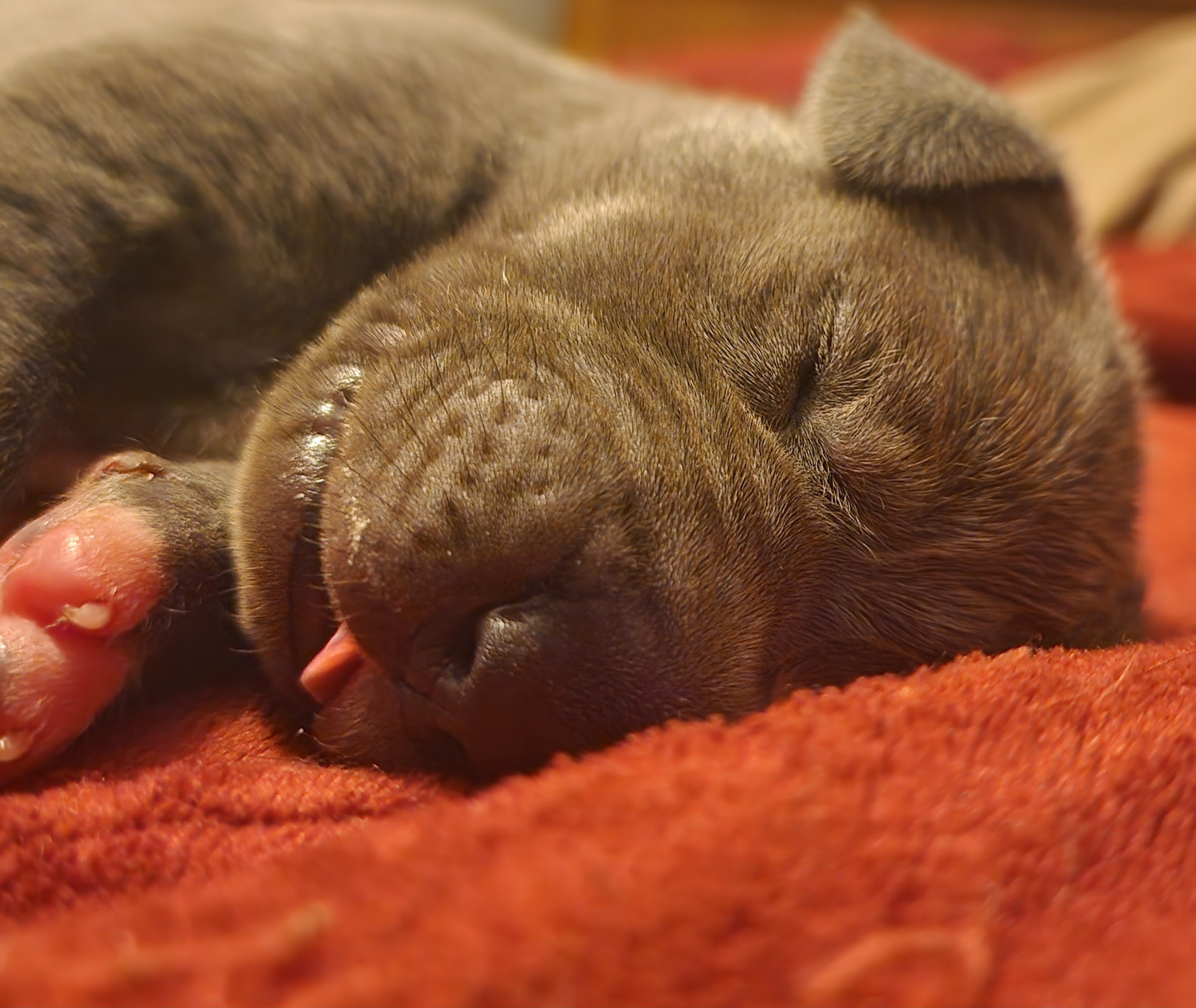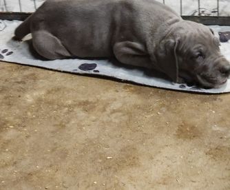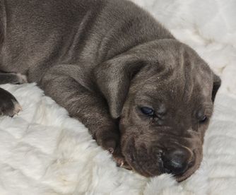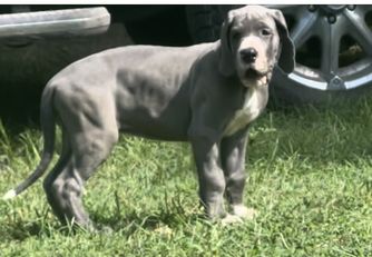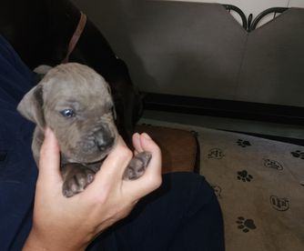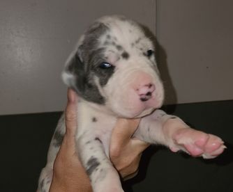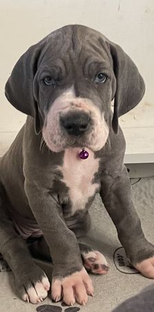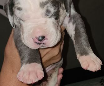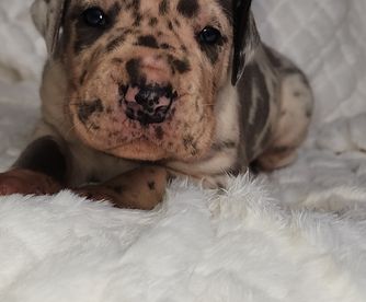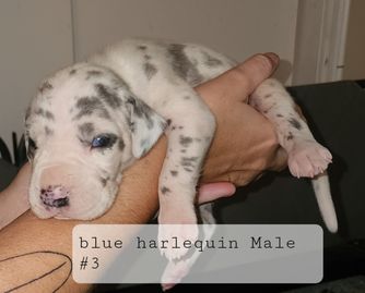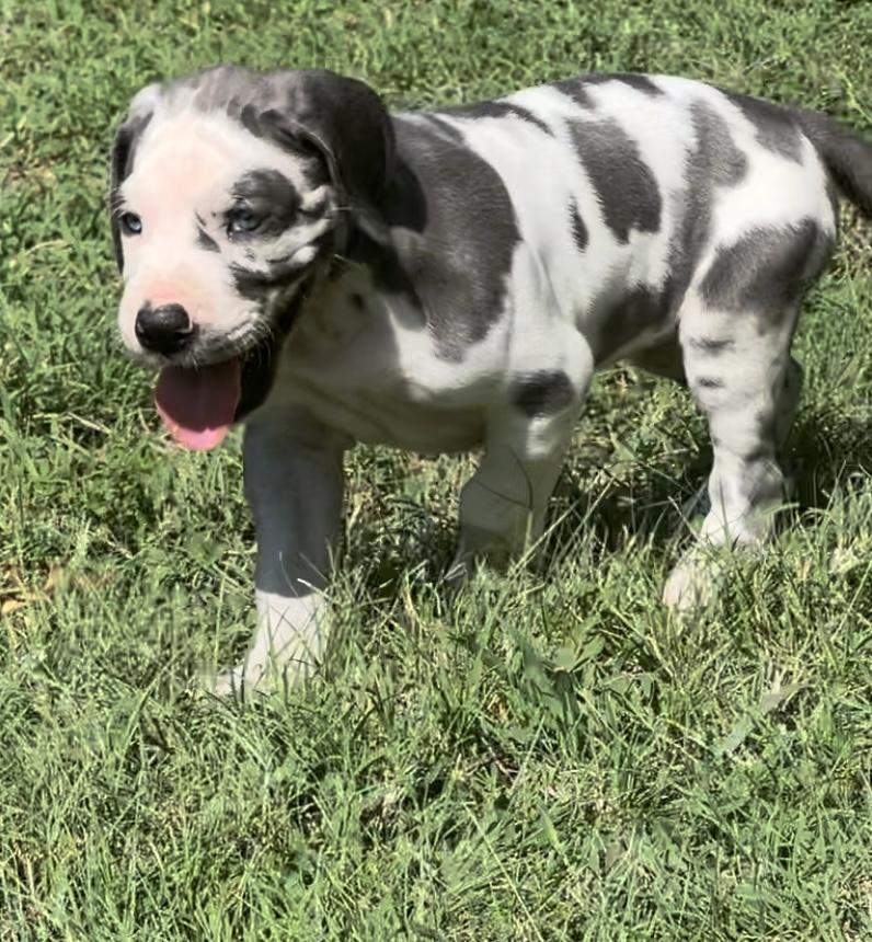 Our puppies include blue brindle, blue and white, blue, and harlequin. Colors will vary depending on the parent dogs.