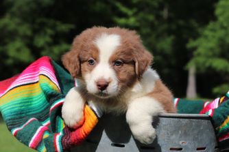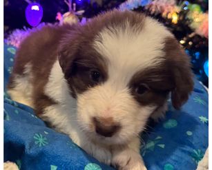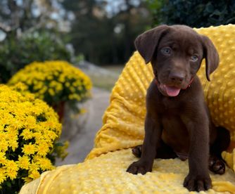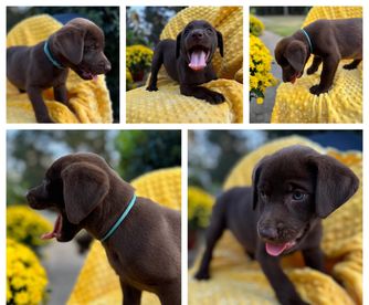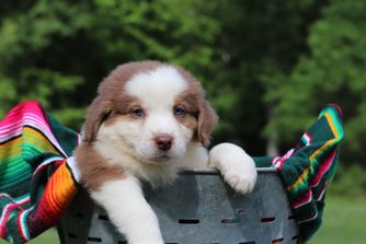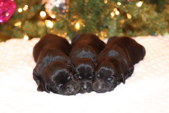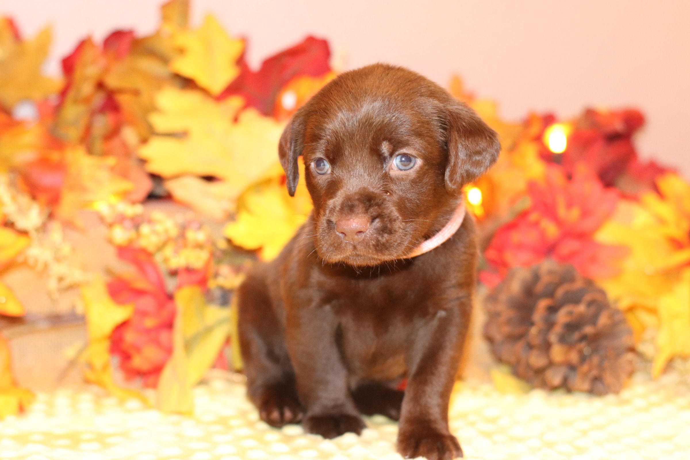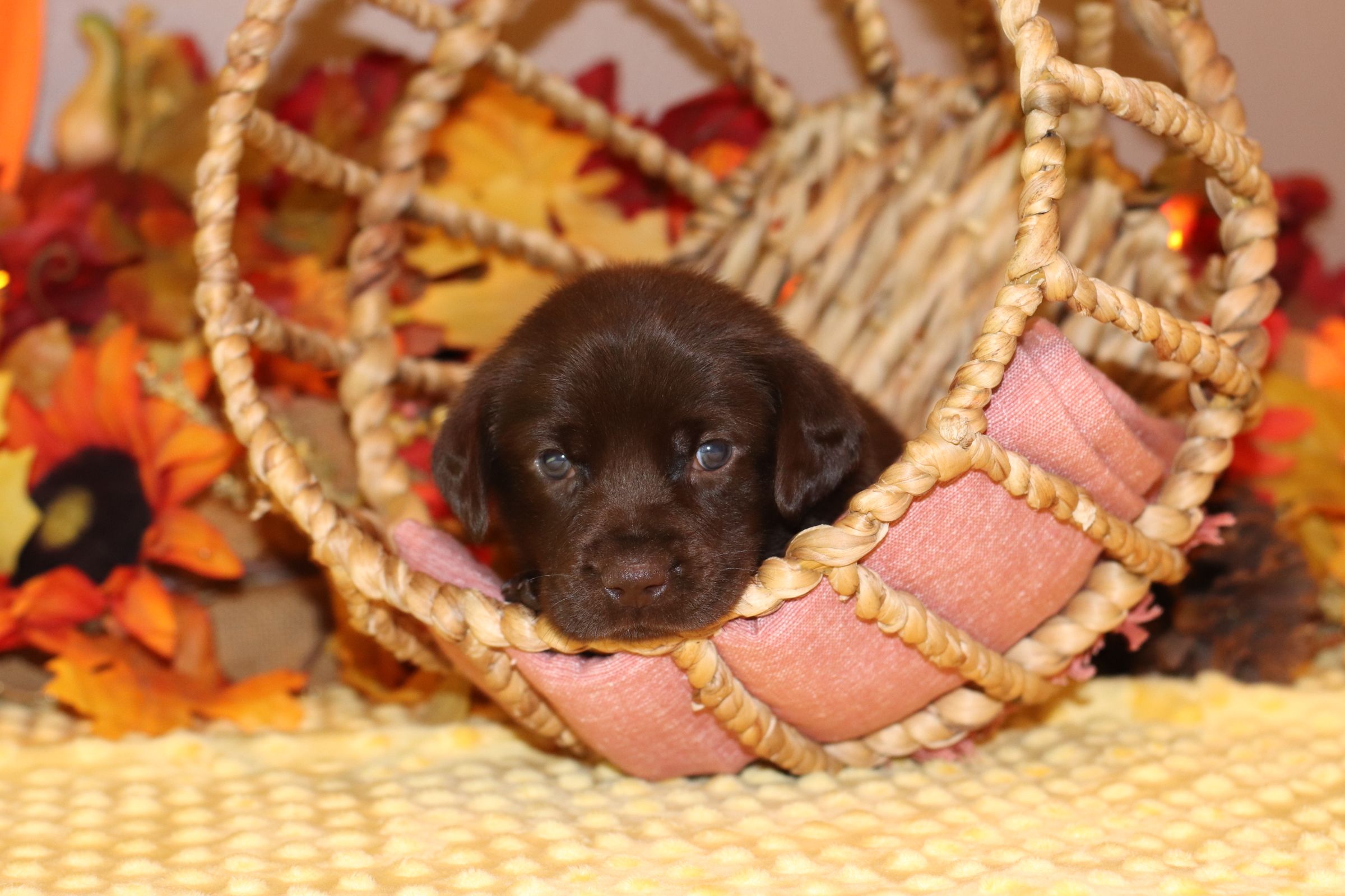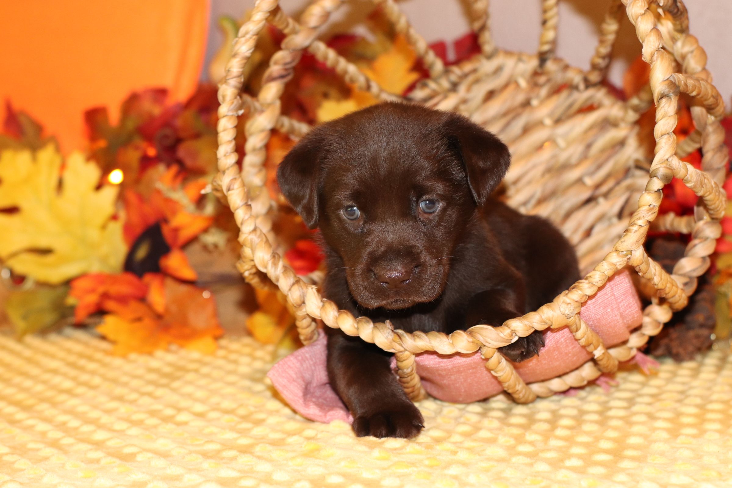 Our Australian Shepherd puppies are red tri-color. Labrador Retriever puppies are chocolate. Colors will vary depending on the parent dogs.