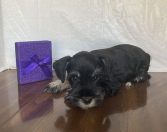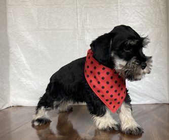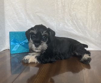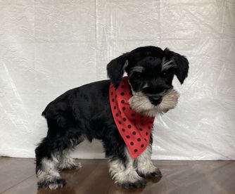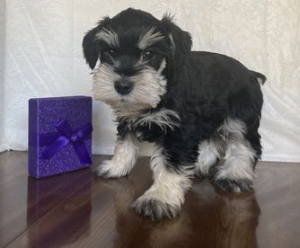 Our puppies include salt and pepper and black and silver. Colors will vary depending on the parent dogs.