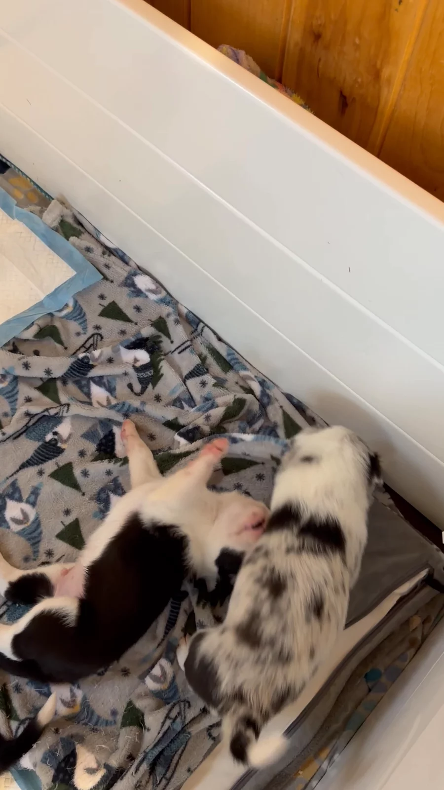 Puppies are 5 weeks old! We've started manding training and introduced the crate. They love sleeping in it with the door left open.