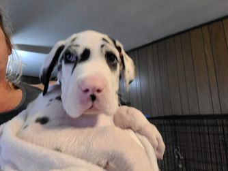 Our puppies include brindle, fawn, harlequin, mantle, merle, and black. Colors will vary depending on the parent dogs.