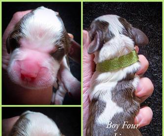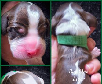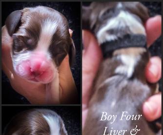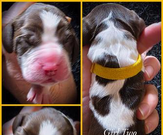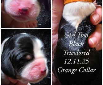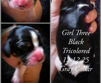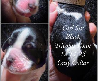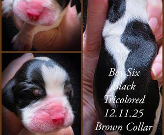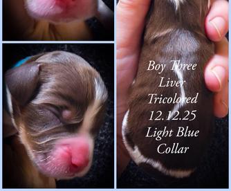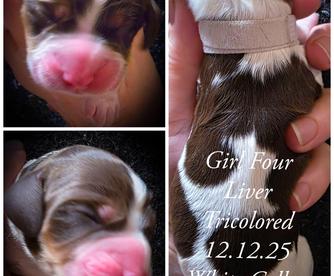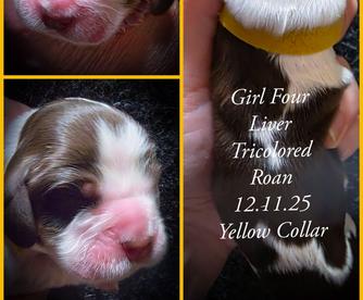 Our puppies include liver white and roan, tri-roan, lemon and white, liver and white, black white and tan, liver white and tan, and black and white. Colors will vary depending on the parent dogs.