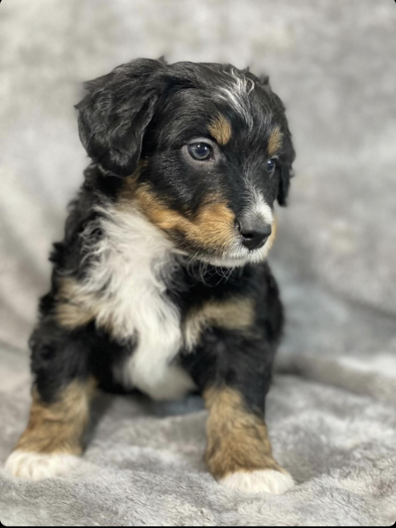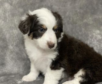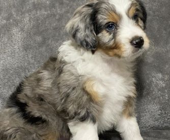 Aussiedoodle puppies include blue merle and black tri-color. Colors will vary depending on the parent dogs.