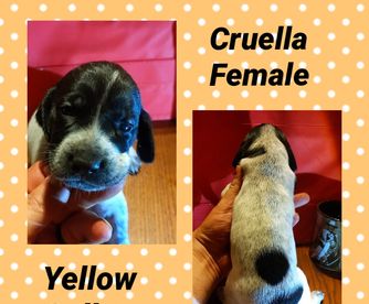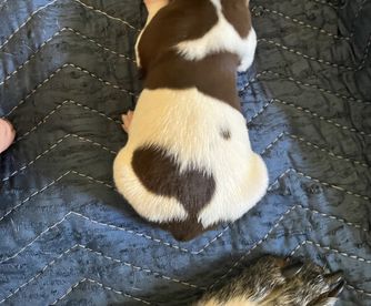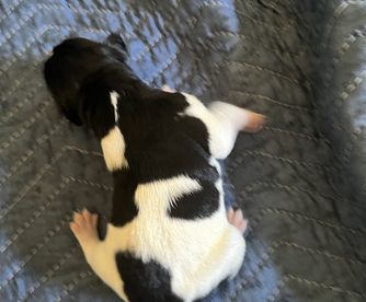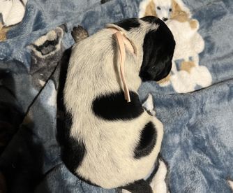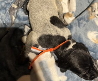 Our puppies include liver roan, liver and white, black roan, and black and white. Colors will vary depending on the parent dogs.