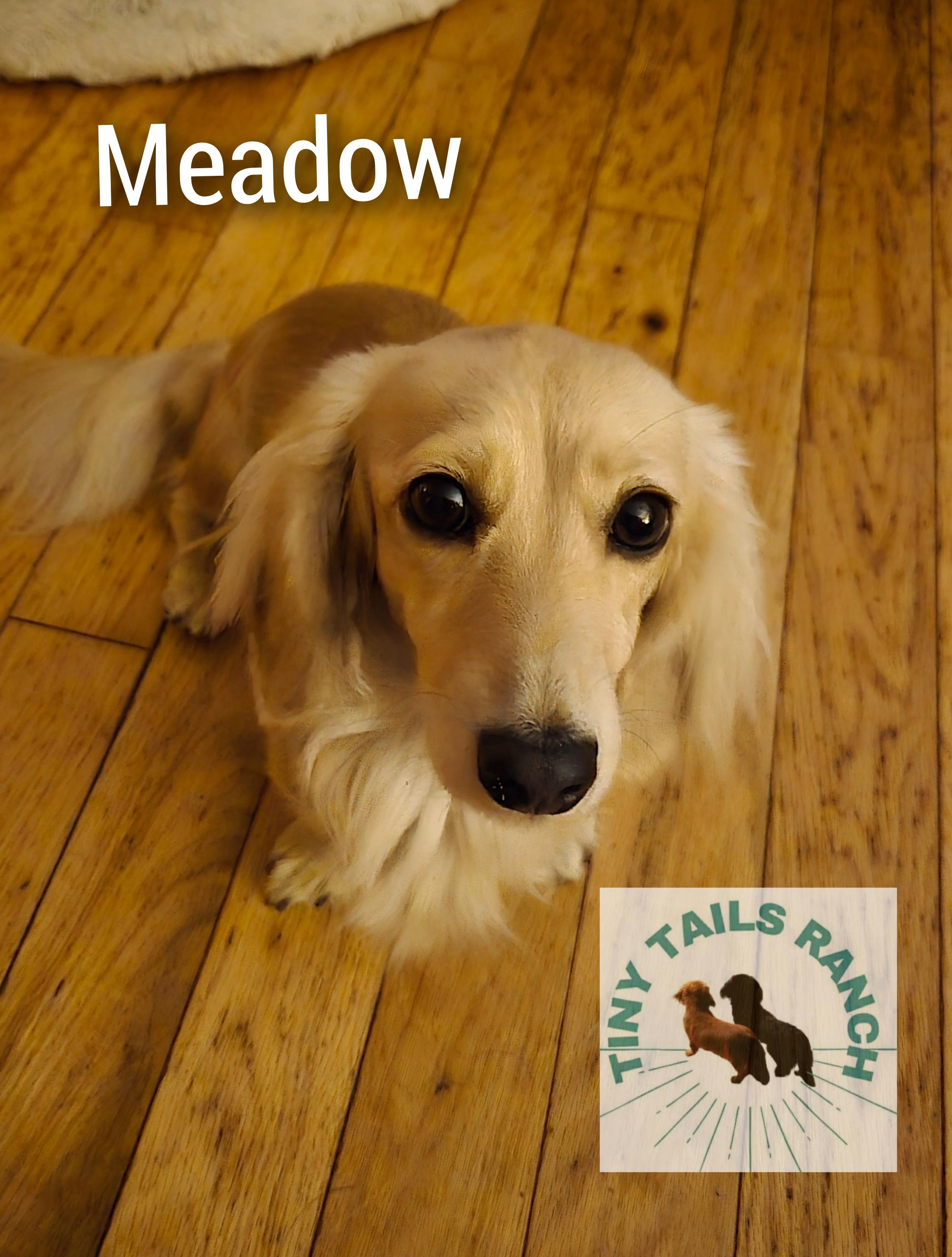 Meadow is a sweet little lady. She is a shaded cream and carries piebald and chocolate genes. She and Milo produced an all-piebald litter, born on 10/19/24. We are repeating this breeding for 2025. This will be Meadow's third and final litter.