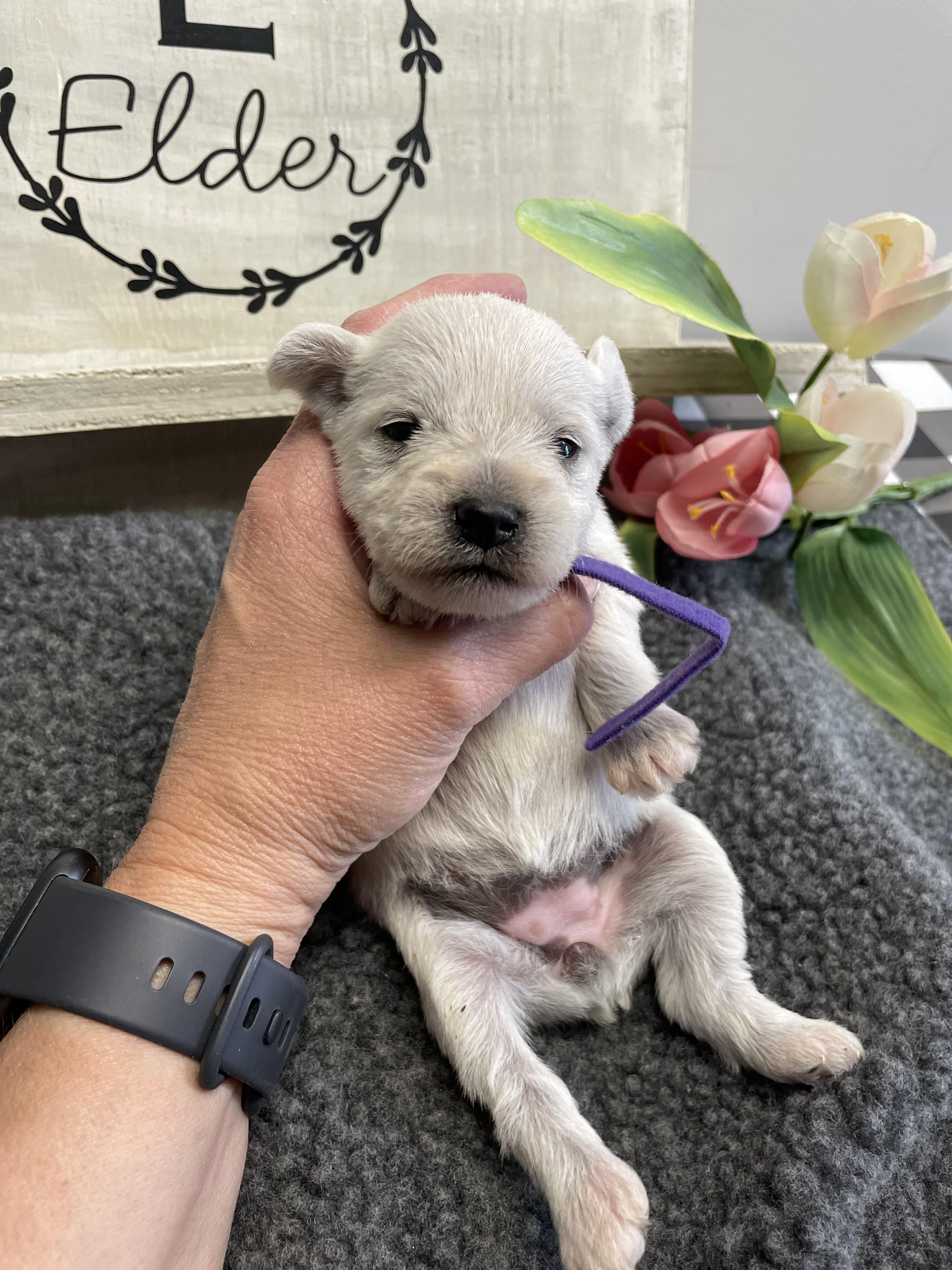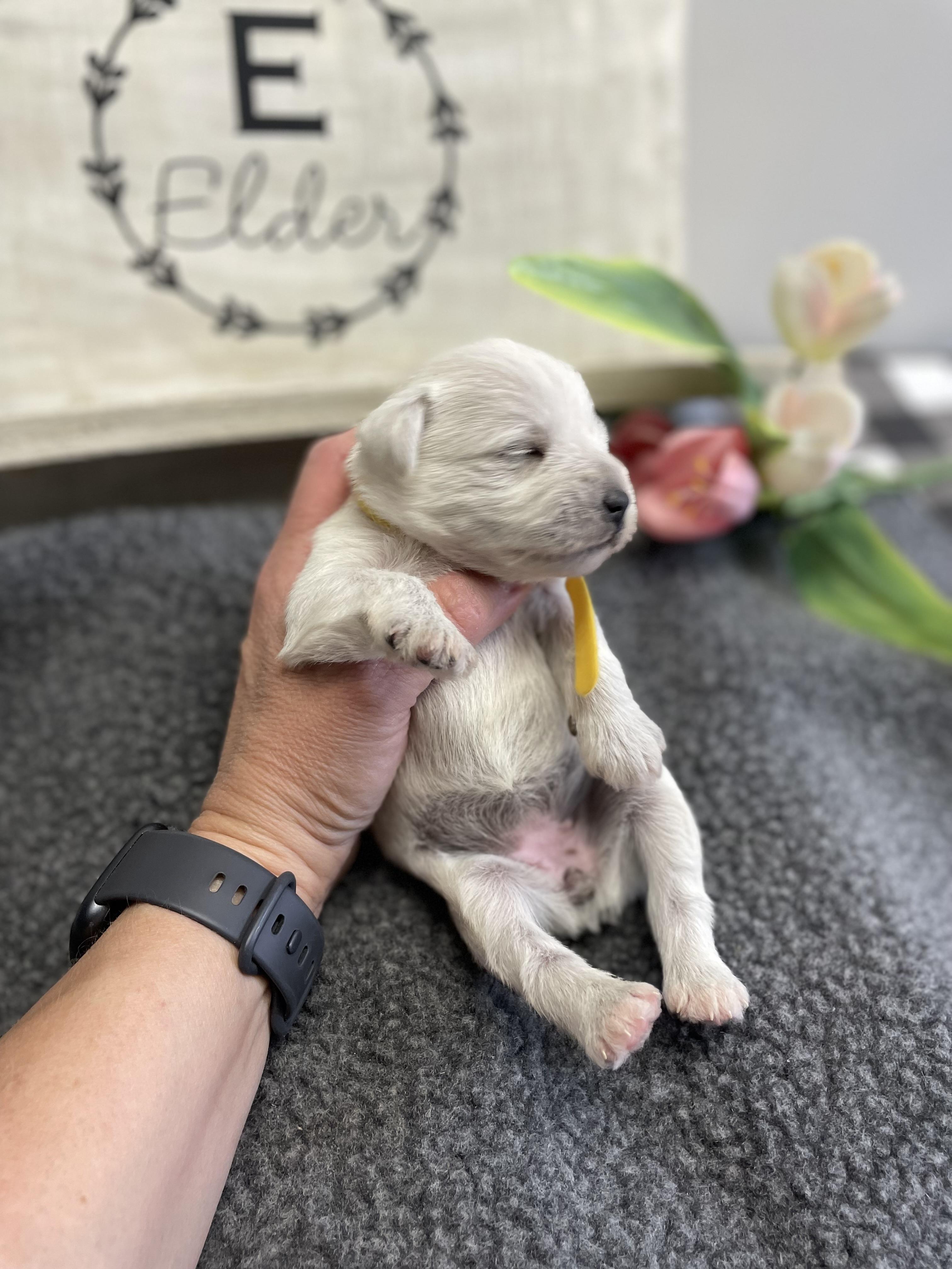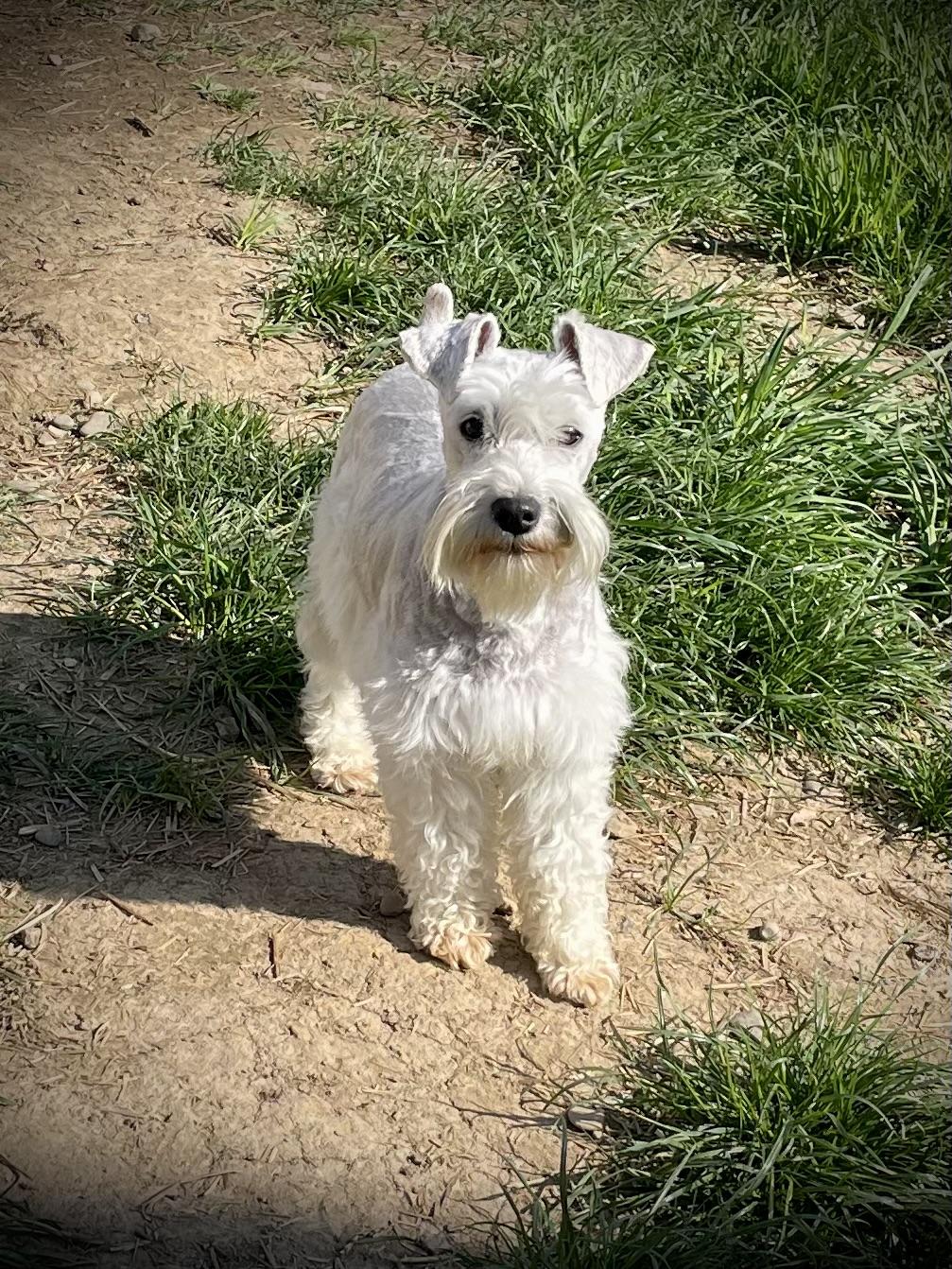 TJ Silver Paws Lil' Miss Maggie. "Maggie" is a sweet, loving & beauty! She loves to run and play, especially bubbles! She loves to chase and pop bubbles!!! She is a beautiful white, medium coated Schnauzer. Maggie is very well put together and weighs right about 16.5 pounds.