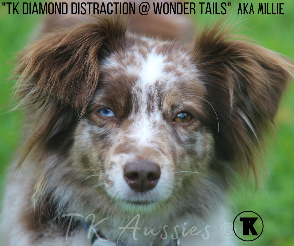 Millie resides in South Texas with Grace, my daughter, where she enjoys a life filled with love, play, and plenty of attention. Her calm temperament, intelligence, and striking merle coat make her an integral part of our breeding program, and we are excited about her contributions to our TK Aussie family.