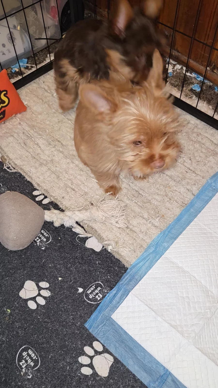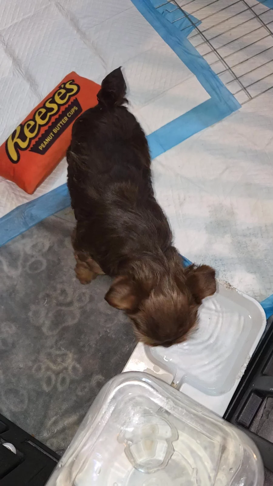 Gizmo is a chocolate-parti Yorkshire Terrier weighing 3 lbs.