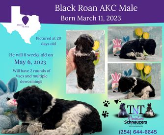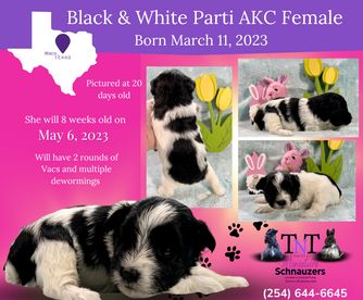 I'm Traci P., the breeder behind TNT Miniature Schnauzers located in Mart, TX. We raise our puppies with total care and attention so they can become well-socialized and loving additions to their forever homes. It’s been such a pleasure to be able to watch every stage of puppy life! We’re so lucky to be able to do this and match wonderful families with our perfect puppies.