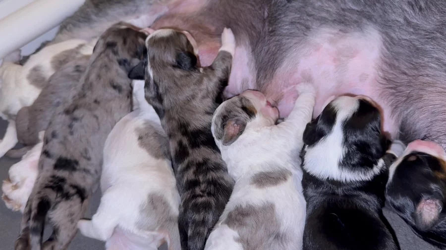 Expected due date: Feb 13th These puppies will be F2B minis averaging 25-35lbs. We’re expected both furnished and unfurnished with a mix of colors ranging from traditional Tri Clolor, Merle, and Parti.
