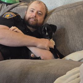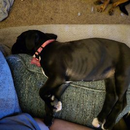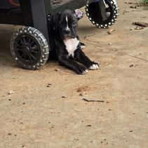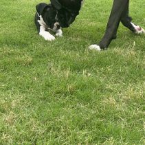 Milo is the sweetest bounciest funniest dog on the farm. He is a gorgeous sealed reverse brindle. He loves going to the feed store and doing errands with me. There is no person that is not a friend to Milo!