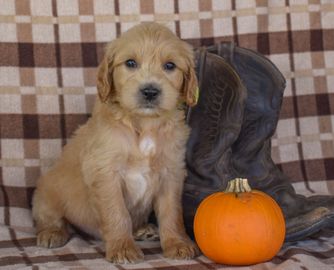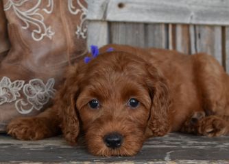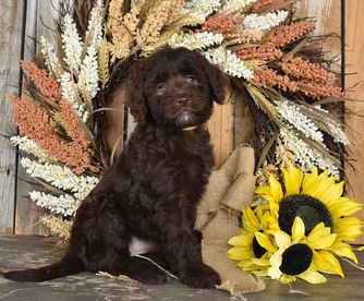 Jasper is a rare chocolate CKC registered F1 Goldendoodle (we have traced his golden retriever pedigree and the mom carries brown). He's a stunning boy with a super affectionate personality. He's social, well behaved and very sweet. We are privileged to have this boy in our program.