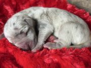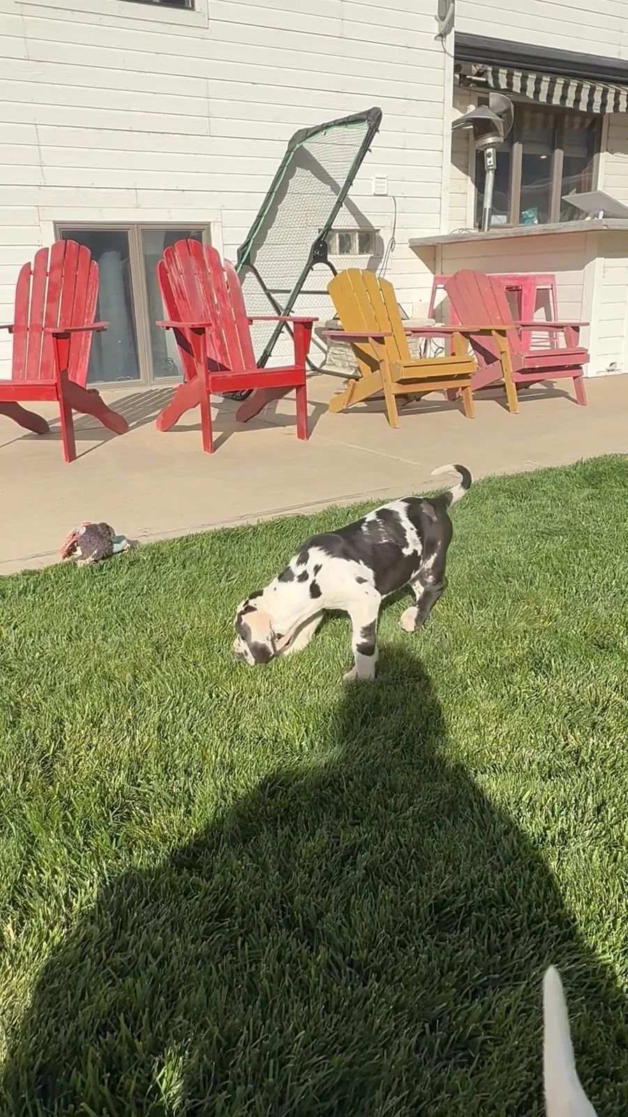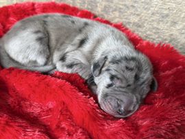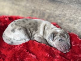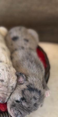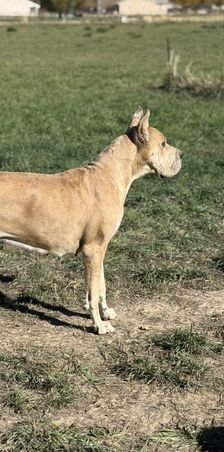 Tawny is a fawn Merle. She is a sweet independent girl with amazing structure and head. She love tug of war and sun bathing.