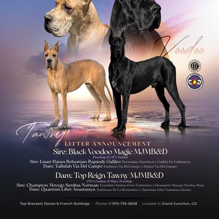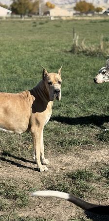 I'm Rae B., the breeder behind Top Brackett Danes located in Grand Junction, CO. Each one of our dogs are picked based on temperaments, health and structure to be added to our breeding program. We range from heavy euro to euros with a tighter face and structured body. All of our dogs are raised around kids and other animals. Our dogs have 8 ac to run and explore and enjoy.