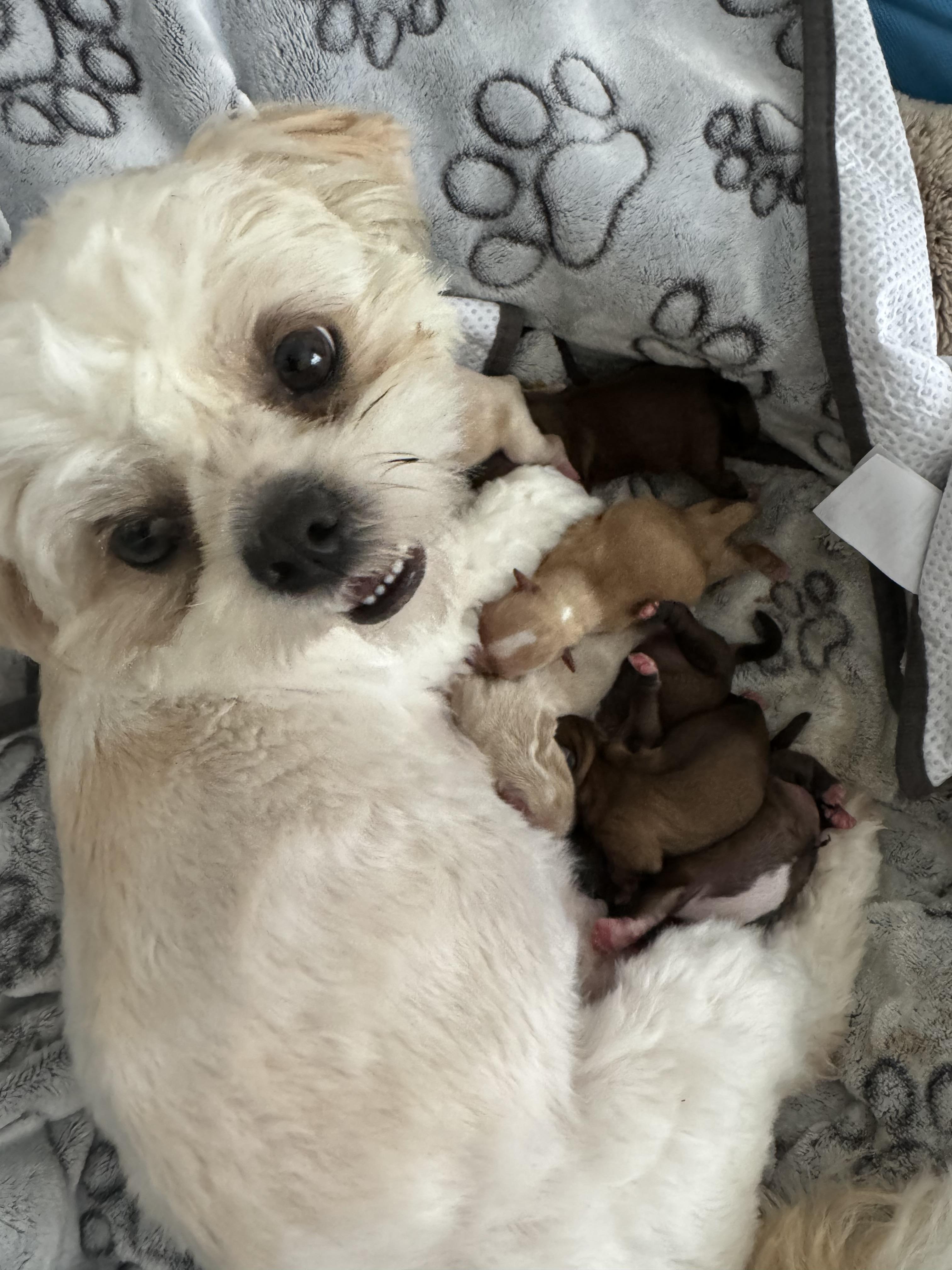 She's one of the best mamas we’ve ever seen. Her puppies absolutely adorable!