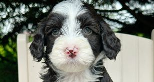 Our puppies include black and white and brown and white. Colors will vary depending on the parent dogs.