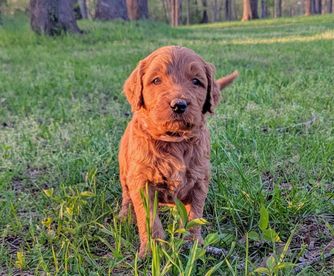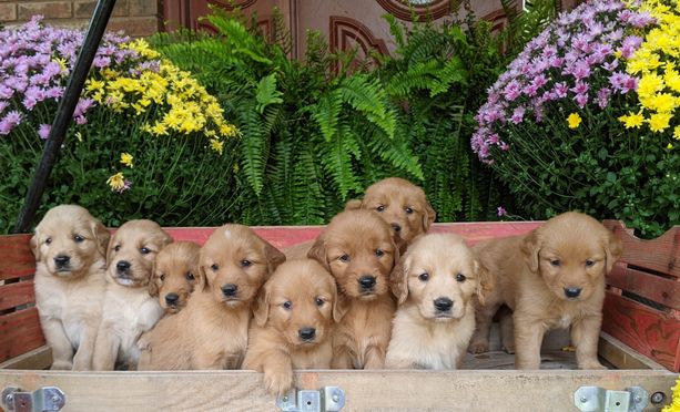 Our Golden Retriever puppies are dark golden. Goldendoodle puppies are red. Colors will vary depending on the parent dogs.