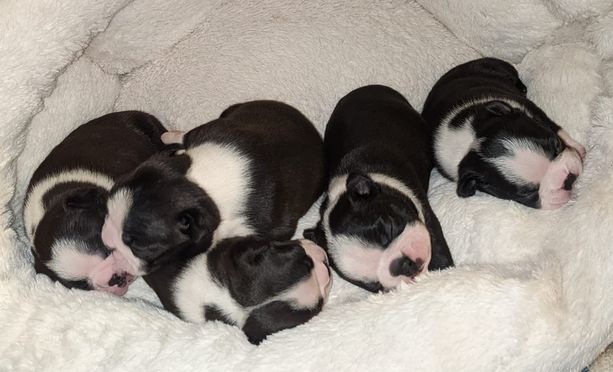 Boston Terrier puppies are black brindle and white. Colors will vary depending on the parent dogs.