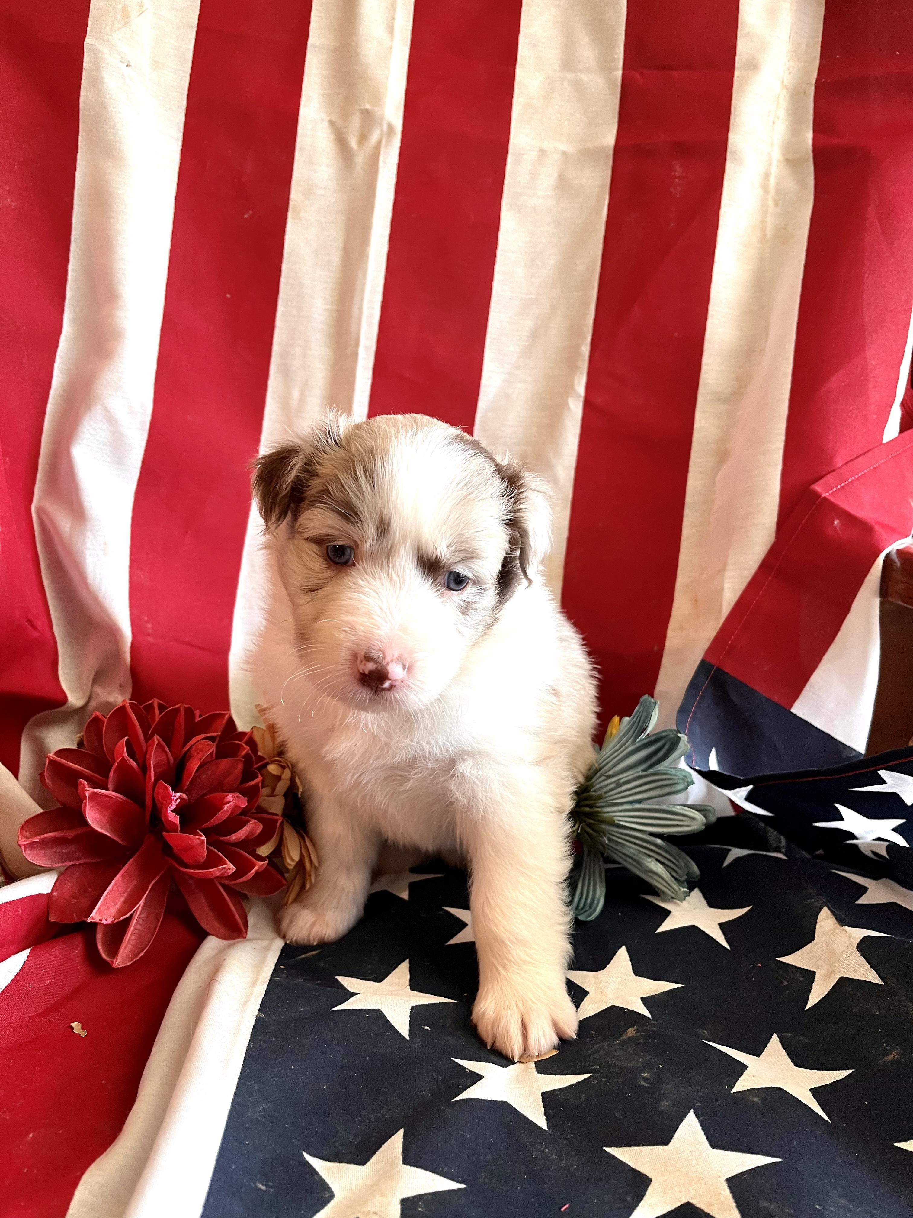 Hazel is a beautiful dark red/liver standard Aussie. She is very loving, yet reserved. She loves being around her people. She loves to play ball and is super fast! She has a big, goofy personality, but, she is happy to lay at your feet or under your chair all day!!! Hazel is AKC/ASCA registered with a great pedigree. She is a bigger girl weighing around 60 lbs.