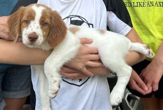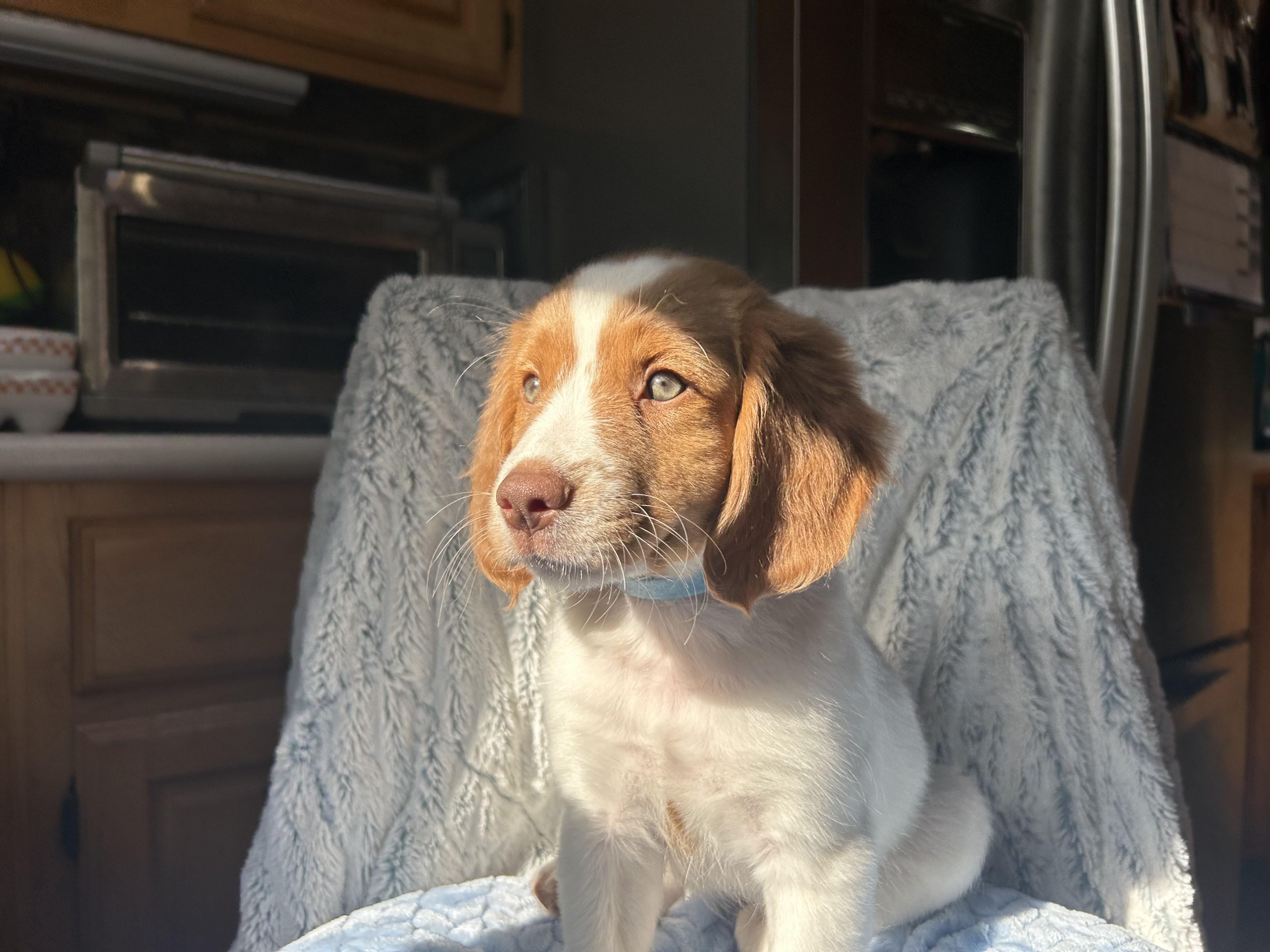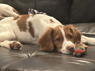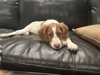 Raindance has won our hearts because she is the SWEETEST Brittany we own. When she nuzzles her head into you while watching a movie it is the best. She's also loves to hunt in the fields and is super smart.