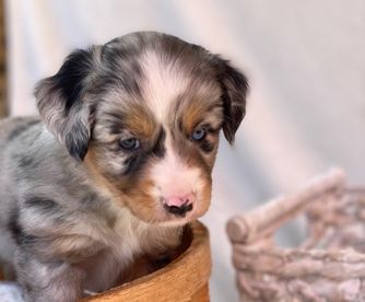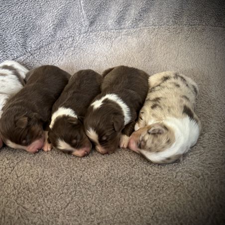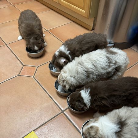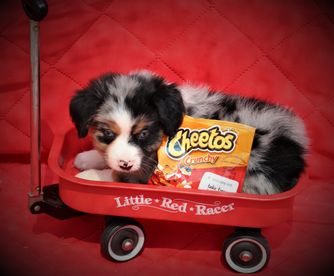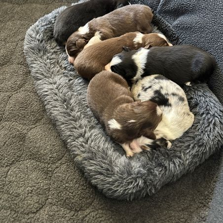 Our puppies include black, red merle, blue merle, and red. Colors will vary depending on the parent dogs.