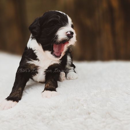 We are delighted with our new puppy! He is so confident and laid back it's clear he has been treated kindly by Trinity. His first night in our home he went right to sleep at bedtime and slept for 6 hours without a peep. Again, that tells me he is a confident puppy that has been treated very kindly. Trinity worked with us to make picking him up convenient for us (driving from another city). She has welcomed our questions and answered them in detail so we can make Gumbo's (formerly Drift) transition to living with us as smooth as possible. Our vet praised Gumbo's physical characteristics and conformation as "show quality." We give Trinity an A+!