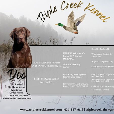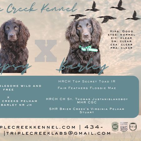 Michelle was great! She is a responsible and ethical breeder. I truly believe in what Michelle is doing, I have a chocolate lab from the RiverxCutter litter. I’m very happy with my puppies temperament. He does well around other animals and in public. He doesn’t have any signs of hip dysplasia. His vet is very impressed with his check ups. He came home essentially potty and crate trained. If you are looking for a working dog or even a “happy to be there pet”, Michelle’s dogs are the way to go. My puppy is eager to please, happy to be included, and has a natural drive for birds. If I had the chance I would choose Triple Creek Kennel over and over again.
