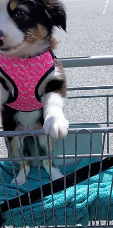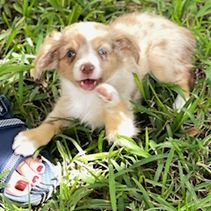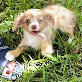 I so enjoyed working with Darlene. She is knowledgeable about the puppies and responsive to all my questions and there were quite a few! I chose Gracie (aka Candy) because my previous dog of 16 years was a red merle, mini aussie. Thought I would try a toy aussie this time. Gracie is growing so fast; and learning even faster. After one week she is getting the idea of the kennel (crate) and should be housetrained shortly. This puppy and I are growing together. Thank you, Darlene, and Good Dog for giving us the chance. Linda Fennell