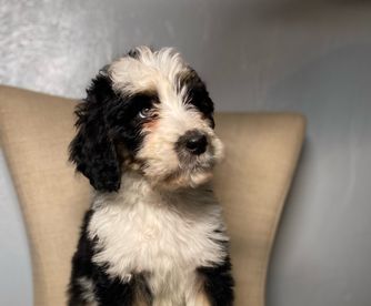 Our Bernedoodle puppies include sable, black and white, tri-color, and phantom. Pomsky puppies include black and white, chocolate, and red and white. Colors will vary depending on the parent dogs.