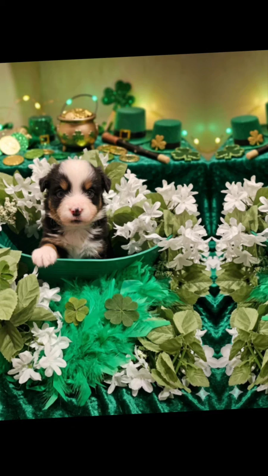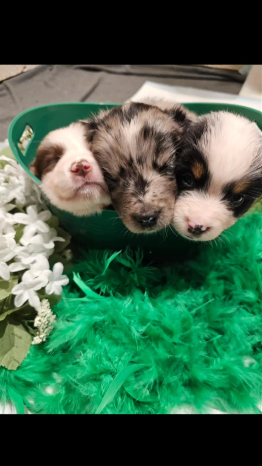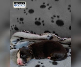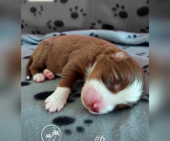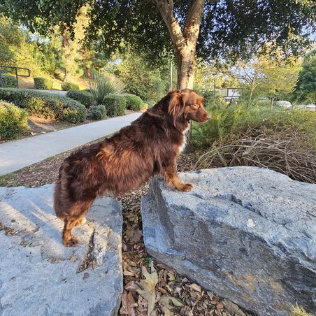 Dixie, is a mahogany red tri Miniature Australian Shepherd, her energetic and boasting a rich, warm brown coat accented by striking white markings on her chest and paws along with warm copper points above her intelligent and hazel eyes. With alert ears and a beautiful wagging tail, she exudes the breed's characteristic agility and grace, hinting at her herding heritage. Dixie is a smart, loyal, and affectionate companion, eager to learn and bringing a vibrant and devoted presence to her litters.