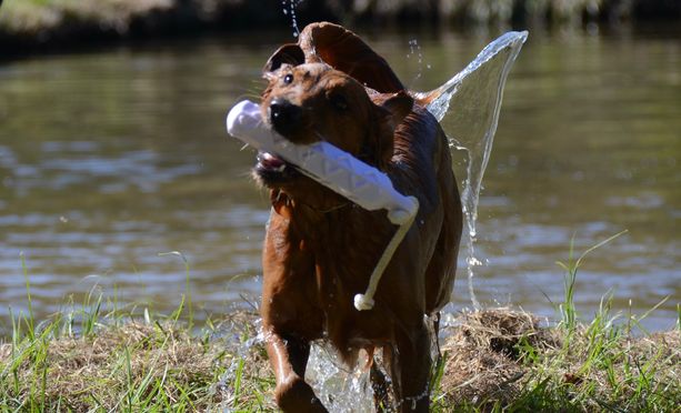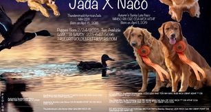 Jada is a fun-loving house dog. Extremely smart and easy to train. Jada wants to please and loves obedience training the most. Her water entries are spectacular and usually 20 feet. Excellent marker and always quiet at the line. The blue ribbons hanging on her neck in her picture were won in one weekend. Jada is my "heart" dog and so much fun to train and show. She lives in our house with us and is gentle with everyone.