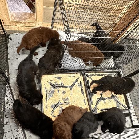 We’ve been working hard on potty training to give all of you families a strong foundation! It’s definitely a work in progress. The puppies have been doing great overall, but recently, for some reason, they’ve started pottying in their bed. To help with this, I reduced the size of their indoor area to make the difference between the potty area and sleeping area more obvious—while still giving them access to the outdoors.