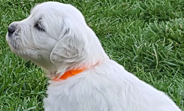 Bella is an AKC registered English Cream Golden Retriever with a gorgeous creamy-white coat. She has a sturdy, well-proportioned frame with a friendly, affectionate nature, keen intelligence, and calm, patient demeanor. Her offspring will make ideal family pets or therapy dogs. Bella loves going on walks, playing in the snow or water and is great around other family pets.