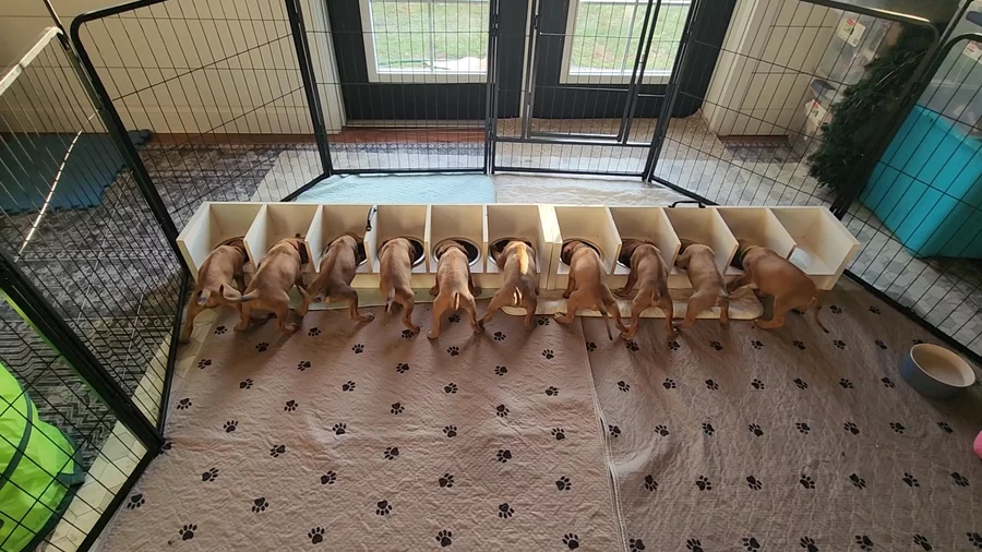 Puppies turned 7 weeks old today! We are working on crate training and clicker training with sit. All sweet healthy babies eatingv3 x a day out of their own bowls. Puppies get their nails dremmeled once a week and none of them care about it except pink girl she doesn't care for it.
