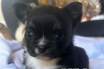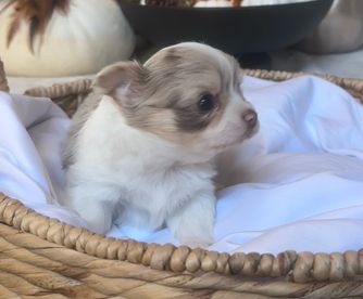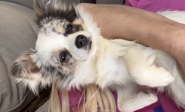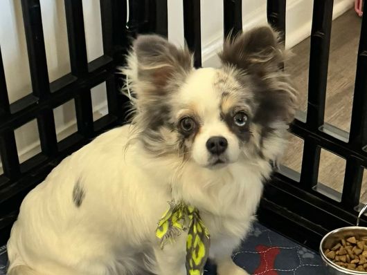 Amelia is a gorgeous, lovable blue Merle long haired chihuahua. She weighs 6 to 7 lbs and is the perfect size. Amelia has a lot of Russian imports in her pedigree, and I am working on getting more info on her lineage so she can be double registered. Amelia’s embark panel came back with great results! She’s a very healthy girl and we love her sweet personality. She is our only chihuahua. 💕