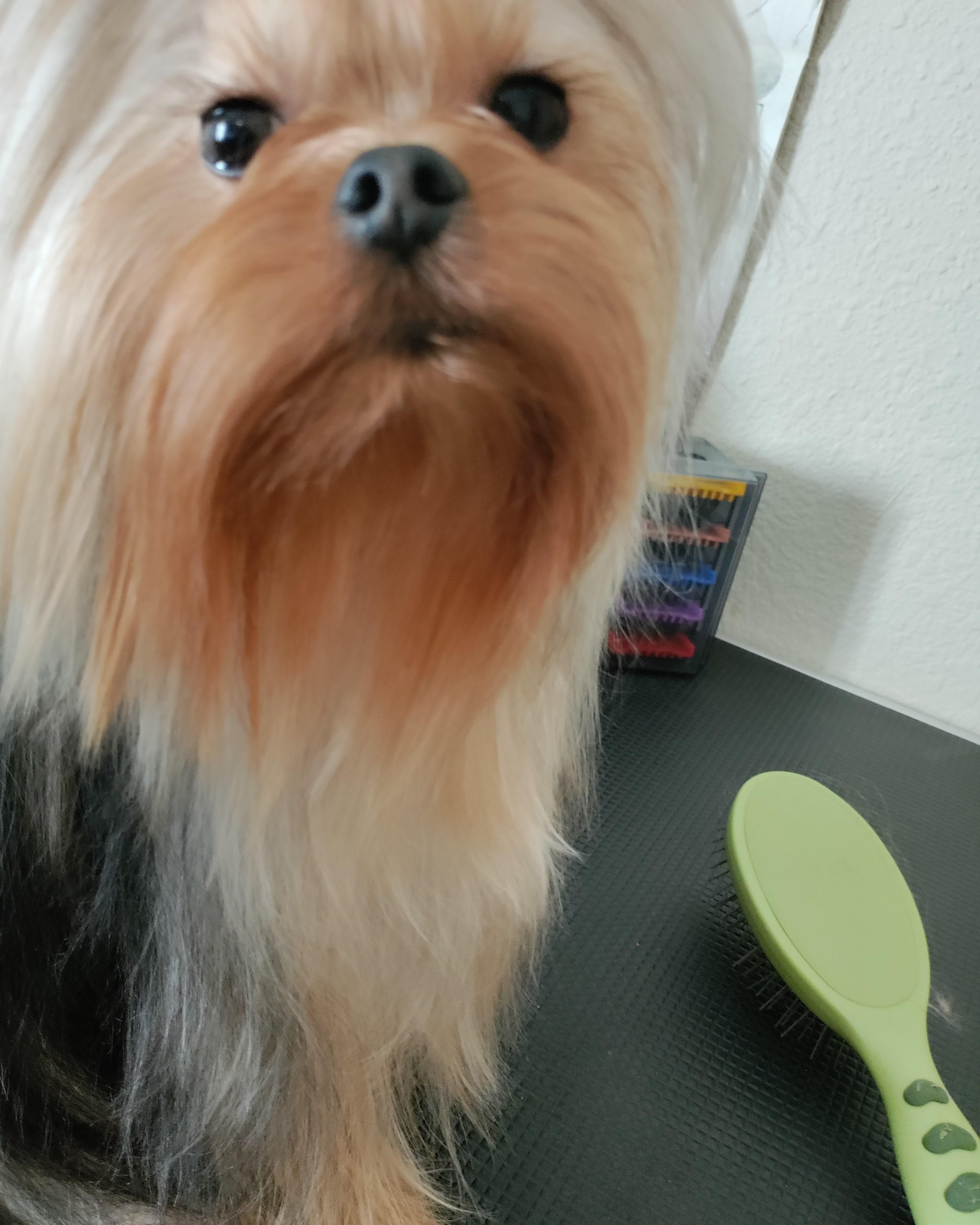 Mirabel is a bigger built female with solid bone structure she has passed all her breed specific health testing and comes from a beautiful pedigree of import dogs from Spain. Although she had a combination coat and is built bigger she still a beautiful Yorkie.She has a wonderful playful and curious disposition and can be a silly playful girl too.