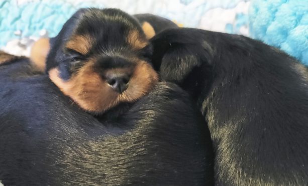 Our puppies include black and gold and blue and gold. Colors will vary depending on the parent dogs.