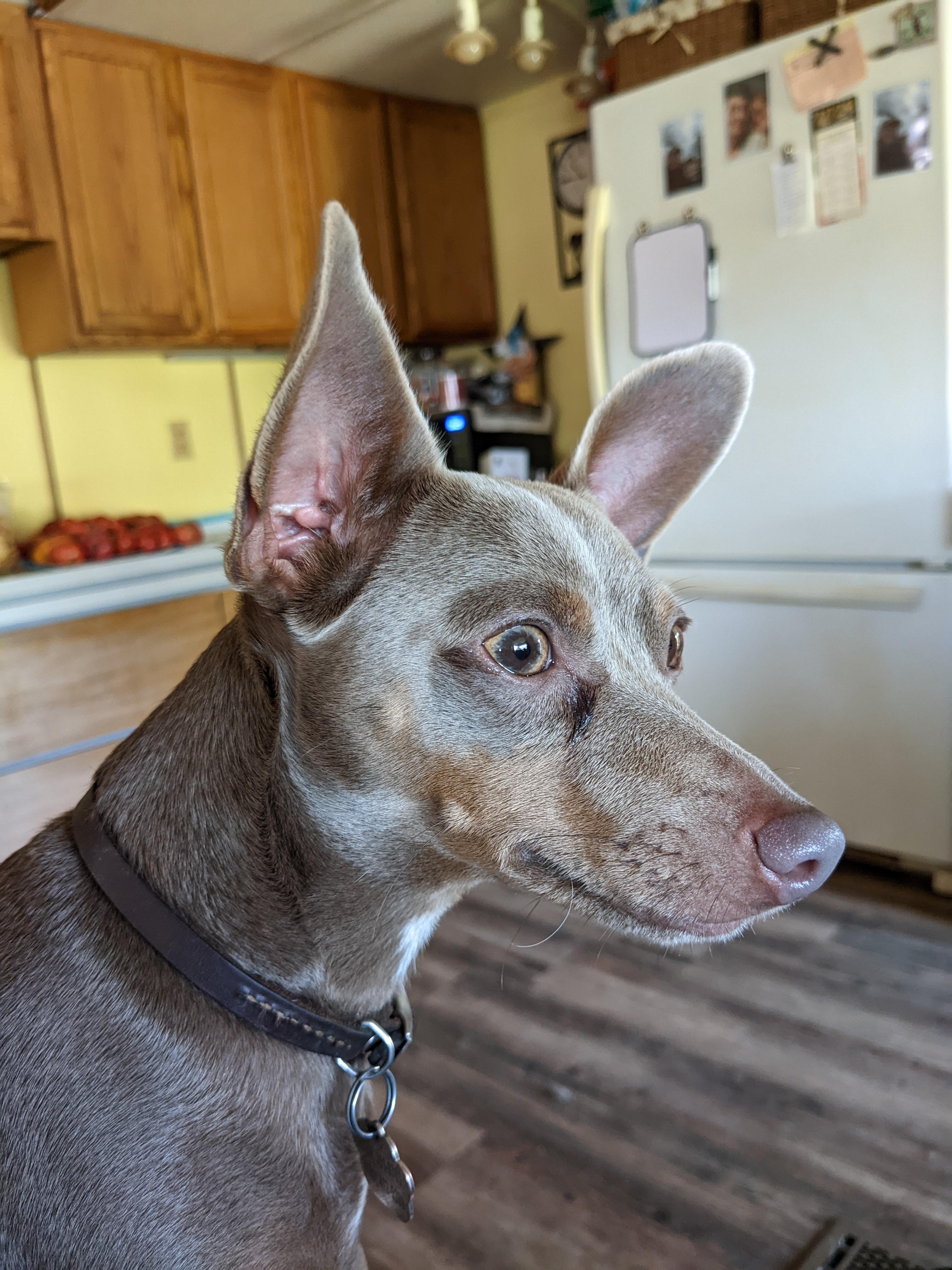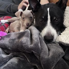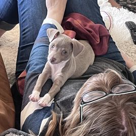 We had been watching for the perfect companion dog for my daughter who has anxiety and depression but is extremely responsible and a great lover of animals. My husband had been wanting a rat terrier for some time and last time we were ready to look for a dog, our friend needed a home for their dog so we adopted a big old lug of a silly goose, who bonded with my son and moved with him when he was stationed in Az. So we were dogless again, with the criteria: Female, Rat terrier, small breed. I wanted a blue one but the dog was for Fran, my daughter. She found Cheryl and her pups on Gooddog, and immediately loved Marcy. I told her to keep looking, that you shouldn’t just get the first dog you see (we had just started to seriously look) and I started sending links to blue puppies lol, but I also noticed all of the options I was finding were not giving the background and the reviews and what seemed to be the security of shopping through good dog- I kept going back and looking at Cheryl’s profile and all her puppies. My daughter Fran had said the week before she loved the “look” of Doberman dogs. I noticed Marcy kind of looks like a Doberman in coloring, and mentioned it. Fran said “She’s the cutest one.”