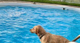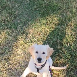 Tsuki is a gorgeous, cream-colored golden with a beautiful temperament. She comes from a long line of bird and hunting skills and absolutely loves to be in the water! She is the gentlest dog with people of all ages and is patient and a perfect mom to her pups. She is loyal and tender but also LOVES to play fetch and pool games with the family. She's seriously the perfect dog!