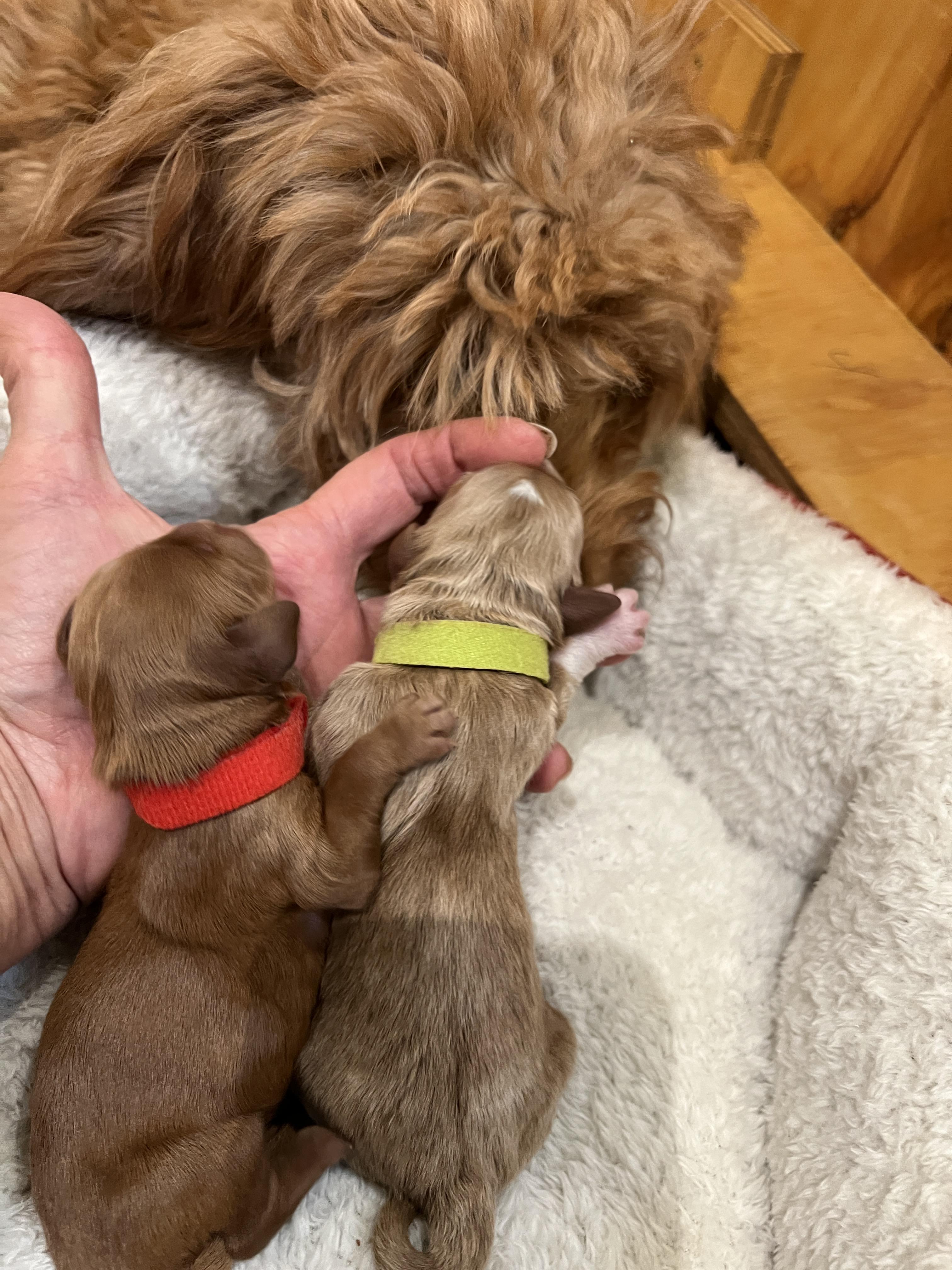 Australian Labradoodle puppies include medium and standard sizes. Goldendoodle puppies include miniature, medium, and standard sizes. Sizes will vary depending on the parent dogs.