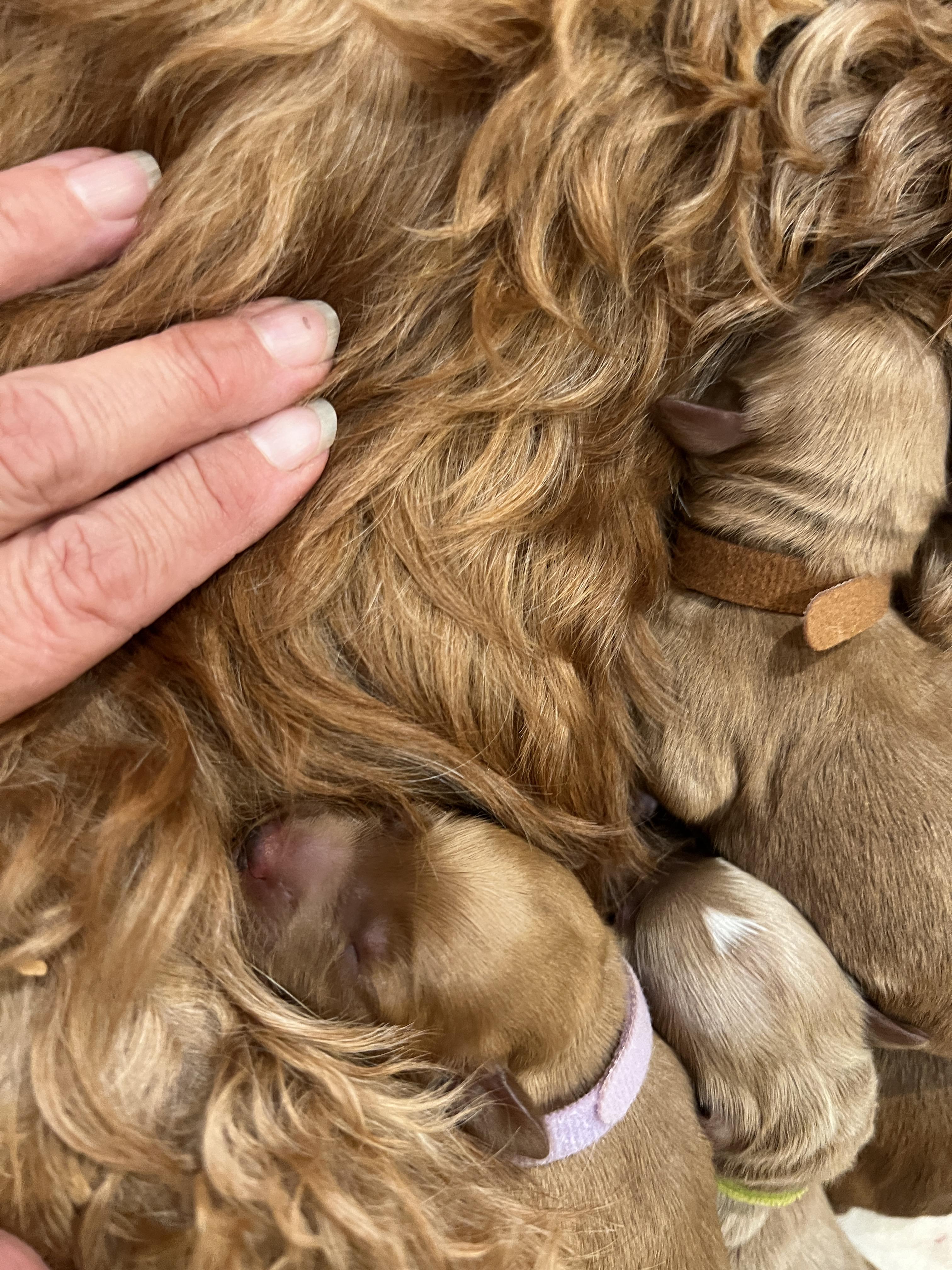 Australian Labradoodle puppies include caramel cream, caramel, apricot, chocolate, cafe, lavendar, parchment, black, and tri-color. Goldendoodle puppies include cream, apricot, red, black, phantom, merle, and parti. Colors will vary depending on the parent dogs.