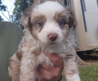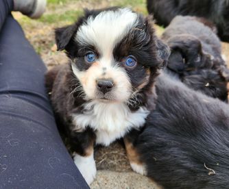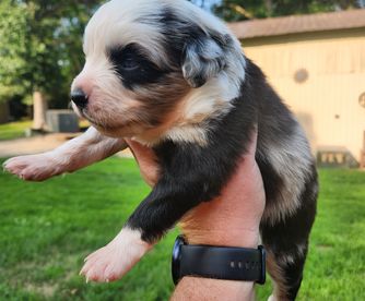 Our Miniature Australian Shepherd puppies include blue merle, black tri, red tri, and red merle. Toy Australian Shepherd puppies include black tri, blue merle, red merle, and red tri. Colors will vary depending on the parent dogs.