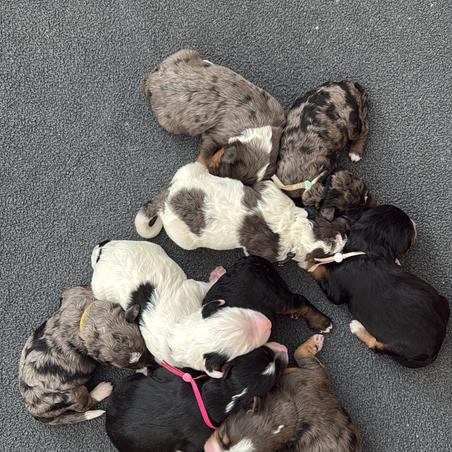 Our Australian Labradoodle puppies include merle, red, and apricot. Goldendoodle puppies include apricot, red, and parti. Bernedoodle puppies include red, tri-color, phantom, blue merle, and merle. Colors will vary depending on the parent dogs.