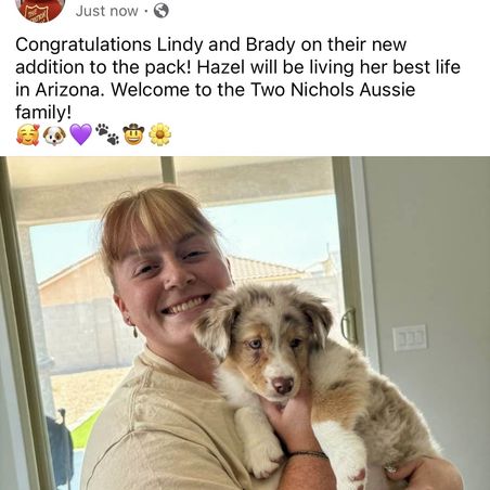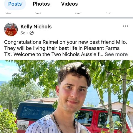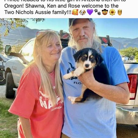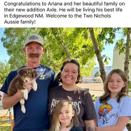 I'm Raul and Kelly N., the breeder behind Two Nichols Aussies located in Alamogordo, NM. My wife Kelly and I breed our dogs to have top qualities that all families want in their puppies, such as compassion, patience, and love! Each of our dogs has brought so much happiness to us throughout their lives. We want to do our part to produce wonderful, healthy dogs that can bring other people joy as well, and we strive to provide each of our puppies with loving homes where they can live happy lives. 🥰🐾 At Two Nichols Aussies we go above and beyond what most breeders do! I have spent lots of time carefully researching to make sure that we provide healthy and well tempered puppies to our families. We start at 3 days of age with neuro stimulation training. Our puppies are handled every day and raised in our home. 😊🐾 Our puppies are introduced to the crate and spend individual time in crates prior to leaving for their forever homes making our families happy and less stress for our puppies. At about 4 weeks we start their confidence training. This training teaches them to be trusting and prevents skittish/fearful behaviors. Your puppy is socialized with children, other dogs, lots of people. We work hard to provide you with a well rounded confident and loving puppy!! Your puppy comes to you microchipped, Litter AKC registered, age appropriate shots, tail docked and dew claws removed. We also provide you with a packet of information to aid in understanding your puppy and to make the transition into its forever home as easy as possible. Your puppy has a blanket and toy that has the scent of mom and litter mates. Also we include a health record. Our puppies come with a lifetime contact to answer any questions or concerns. I hope that helps give you an idea of who we are here at Two Nichols Aussies 😊 🐾 If you decide you definitely want a Two Nichols puppy a $500 deposit will hold you a place on our waitlist. I can put you on the waitlist without a deposit as well however those with a deposit have first choice. Your deposit is refundable until you choose a specific puppy at which time it becomes non refundable. I can send you a copy of the contract and a receipt once I receive the $500 deposit. I also like to chat with you prior to a deposit. I will update with pictures of your baby as he/she grows with us. Thank you so much for reaching out to us to find you the perfect fur baby! 😊🐾 Blessings, Kelly Nichols Two Nichols Aussies.