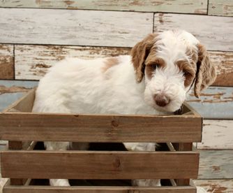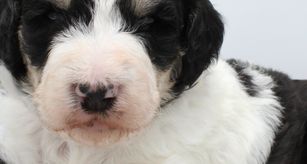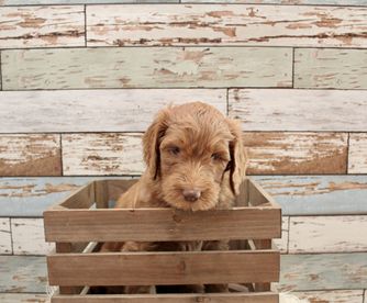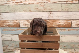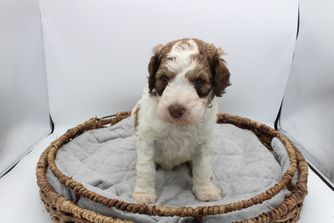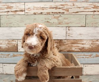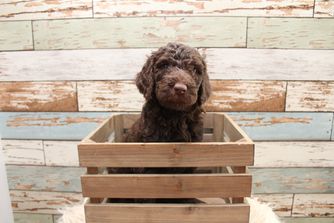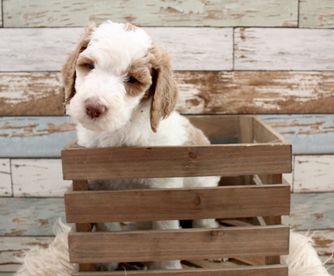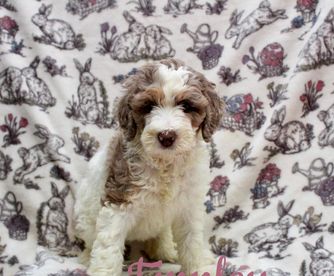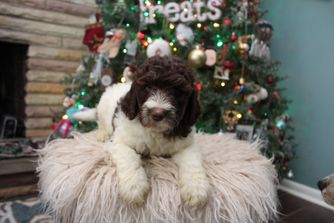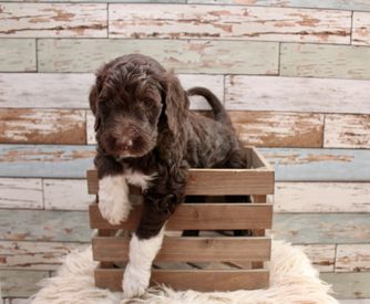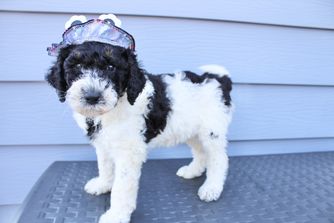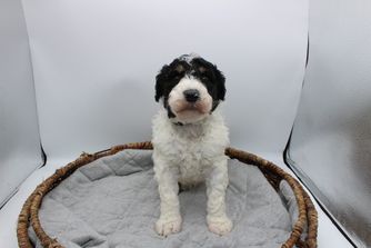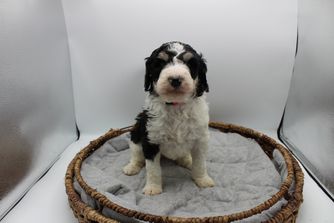 Our Bernedoodle puppies include black and white and tri-color. Goldendoodle puppies include cream, apricot, red, chocolate, black, phantom, and merle. Colors will vary depending on the parent dogs.