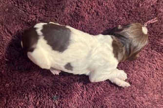 “Our pups are AKC registered with Limited Registration, full registration to be granted after health tests and passing hunt test (AKC JH or NAVHDA NA) and OFA health testing hips (OFA or PennHip), elbows, heart, and thyroid. Tails docked to 1/2 length and dew claws removed, dewormed at 3/6 weeks, first round of shots given at 7 weeks, and microchipped prior to transfer to the new owner. All puppies are the same price regardless of sex, color, or size. The puppy picking order is determined by receipt of deposit.”