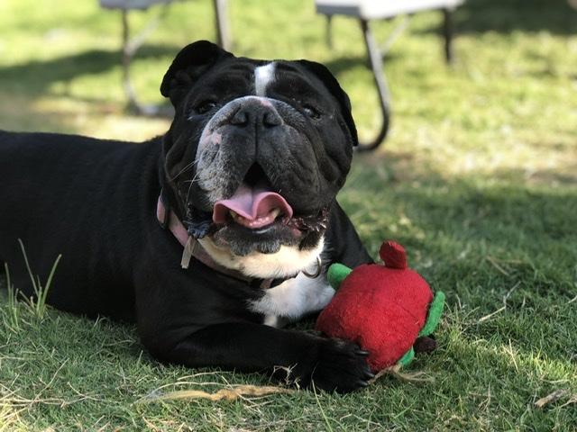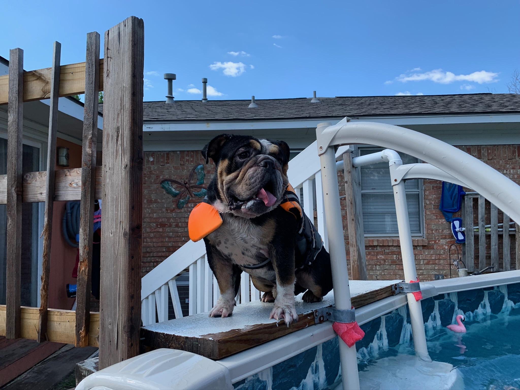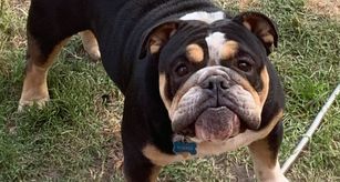 Rubble is an average size (slim-muscular built) black tri English bulldog. He is energetic. He is protective of his people. He has great athleticism. He LOVES the water. Rubble loves to play and enjoys hanging out with all of his family. He also thoroughly enjoys this stud gig. ;)